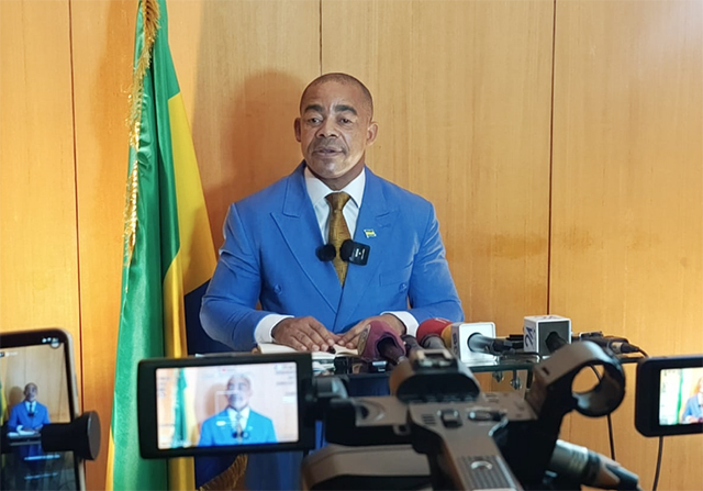 Le Ministre de la Communication et des Médias, Germain Biahodjow, lors de sa Conférence de presse, dimanche 08 mars 2026 à Libreville. Montée...