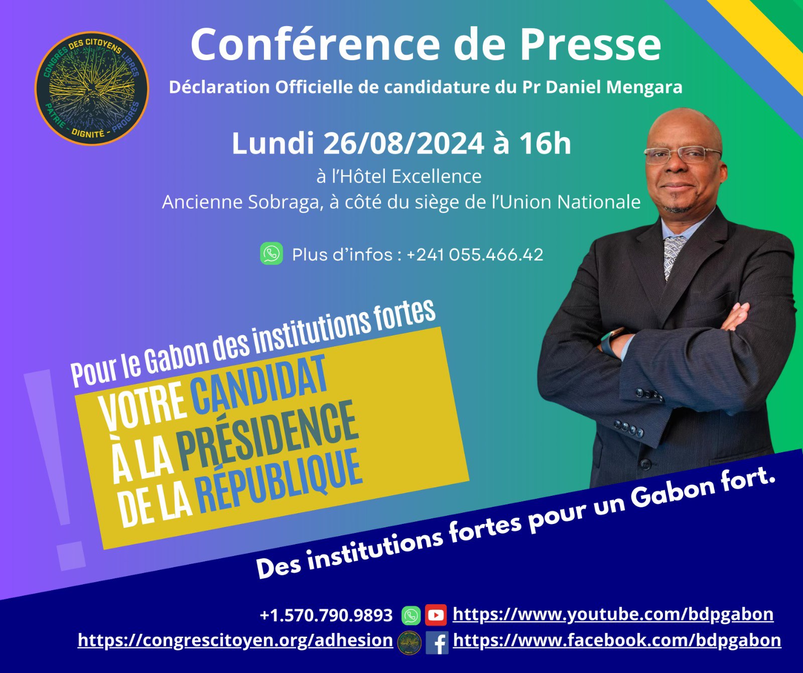 Le Professeur d’université Daniel Mengara, devra animer une conférence de presse cet après-midi à Libreville pour officialiser sa candidature à l’élection présidentielle de 2025.