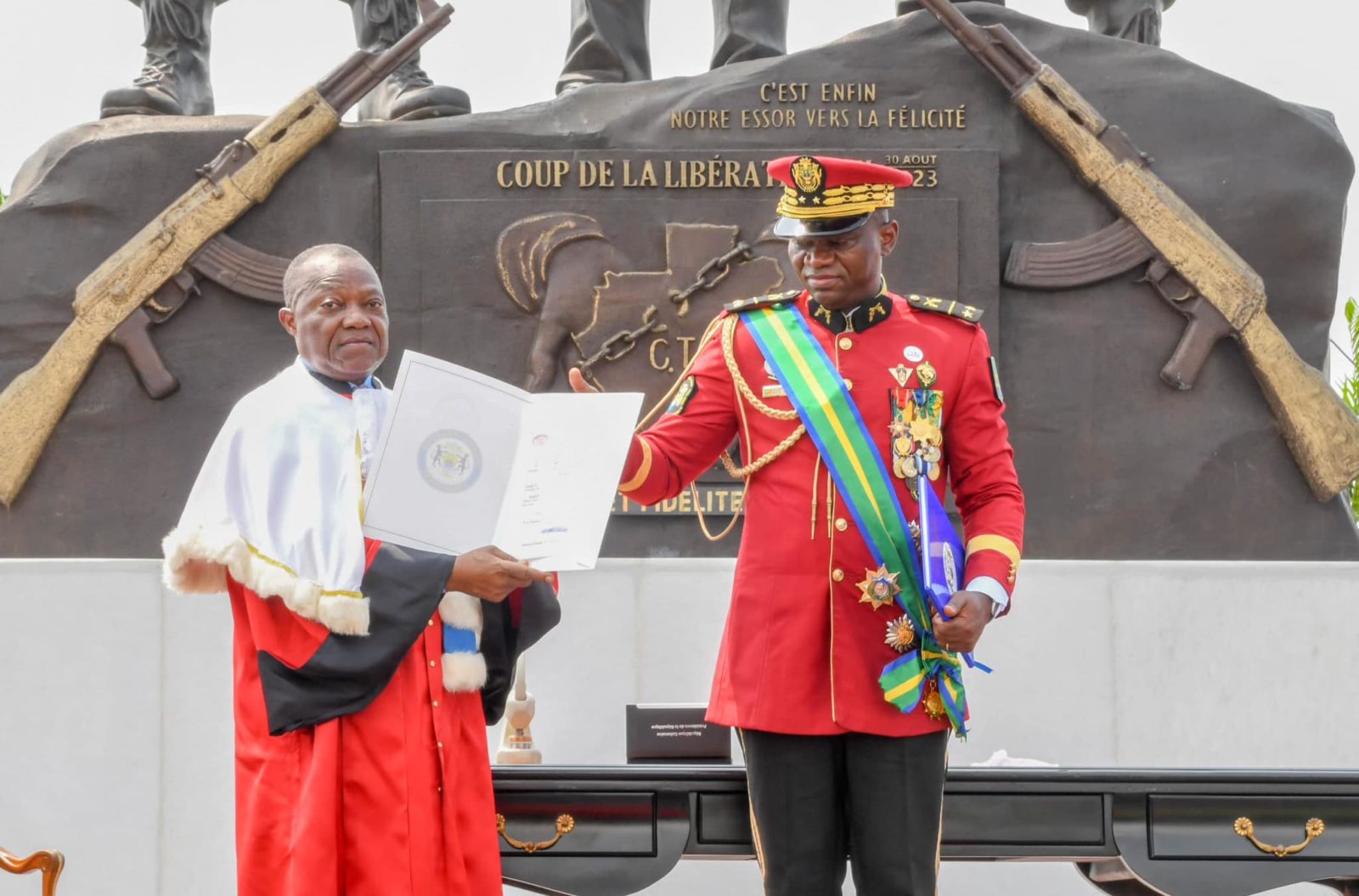 Le Président de la Cour Constitutionnelle, Dieudonnée Aba’a Owono et le Président de la Transition, Brice Clotaire Oligui Nguema, brandissant la nouvelle constitution Gabonaise à la face du monde.