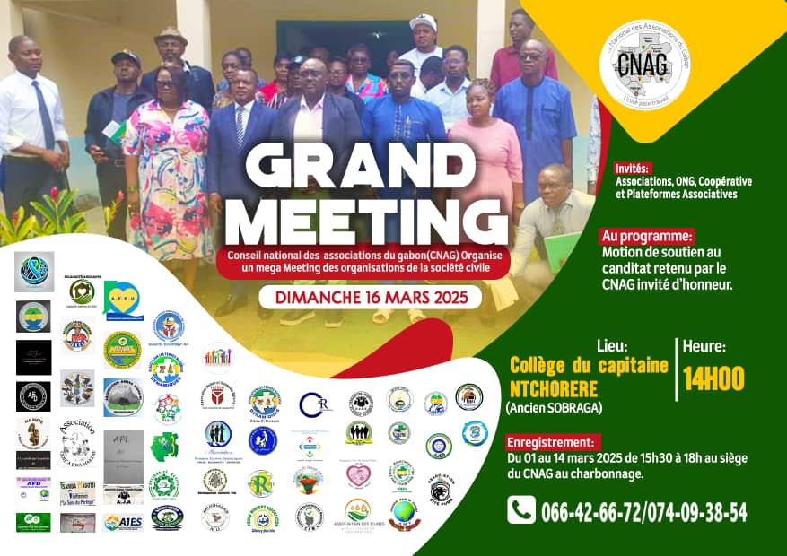 Le Conseil National des Associations du Gabon organise un grand meeting ce dimanche 16 mars 2025 à partir de 14h00, au Collège Ntchoréré de Libreville, pour certainement inviter les populations à se mobiliser derrière la candidature du Président de la Transition, Brice Clotaire Oligui Nguema, à la présidentielle du 12 avril prochain.