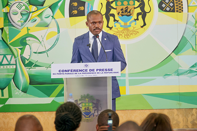 Le Porte-Parole de la Présidence, Théophane Zame Nze Biyoghe, le 12 juin 2025 au palais de la Rénovation de Libreville.