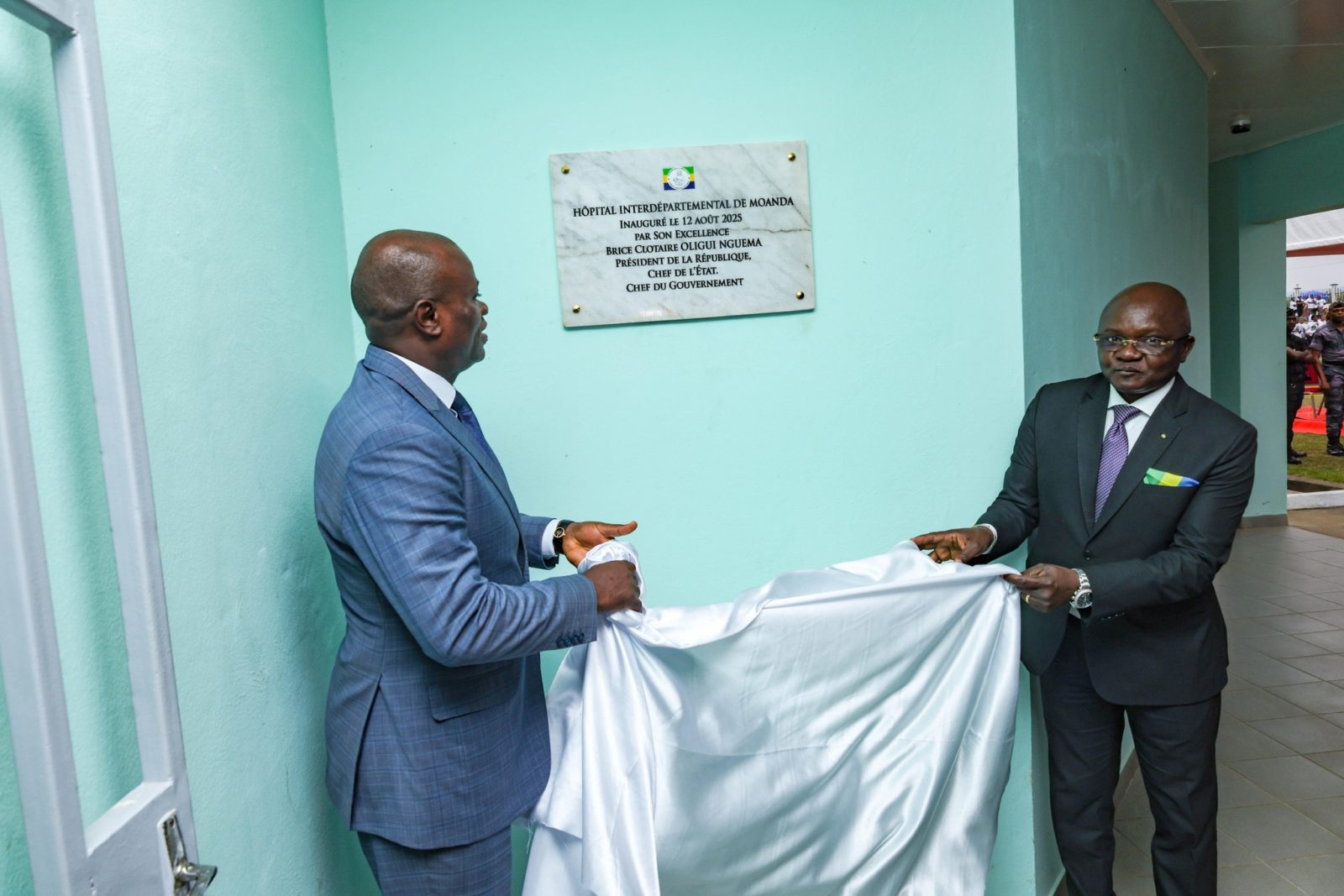 Le Président Brice Clotaire Oligui Nguema et le Ministre de la Santé Adrien Mougougou, lors de l’inauguration de l’hôpital interdépartemental de Moanda, mardi 12 août 2025. Com. Présidentielle