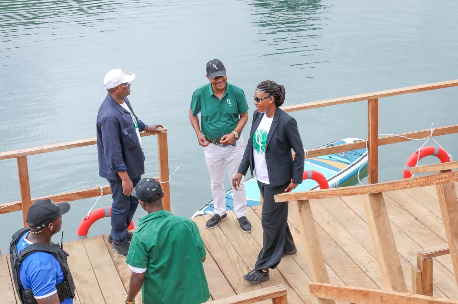 Le couple Présidentiel Oligui Nguema, suivant attentivement les directives du Ministre du Tourisme, Pascal Ogowé Siffon, au lac Bleu de Mouila, mardi 26 Août 2025. Com. Présidentielle